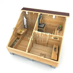 Это квадратная классическая модель бани с тремя отделениями: предбанником, моечной и парилкой. Для удобства пользования предбанник оснащен лавочкой и вешалкой. В моечной находится лавка и полочка из кедра. Парилка оборудована двухуровневым открытым полком и печью. За счет небольших размеров баня нагревается не более 30 минут. Каркасно-щитовую баню можно заказать как в готовом, так и в разборном варианте. В разборной модели готовые щиты из кедра быстро собираются в полноценное строение, что также позволяет исключить лишний строительный мусор. Такая баня не требует полноценный фундамент, поэтому при необходимости ее можно перенести в другое место.