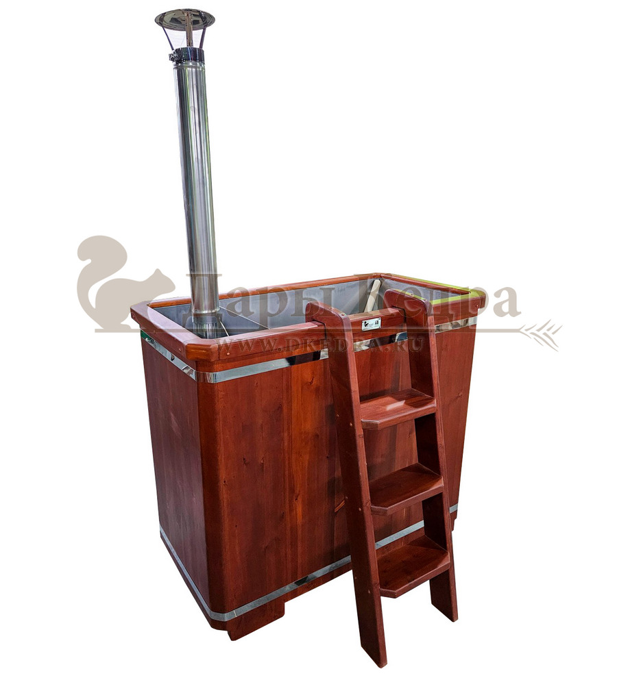 Фурако со встроенной металлической чашей, печью и внешней отделкой из массива кедра - это уличная баня, которой можно пользоваться круглый год. Купель представляет собой прямоугольную емкость для воды, внутри которой располагается сиденье и трап для ног из кедра. Нагрев воды происходит за счет встроенной печи, которая находится внутри купели за перегородкой. Рекомендуем приобрести термокрышку и весло для перемешивания воды для ускорения нагрева. Для удобства пользования японская баня фурако с металлической вставкой оборудована внешней и внутренней лестницей из кедра.