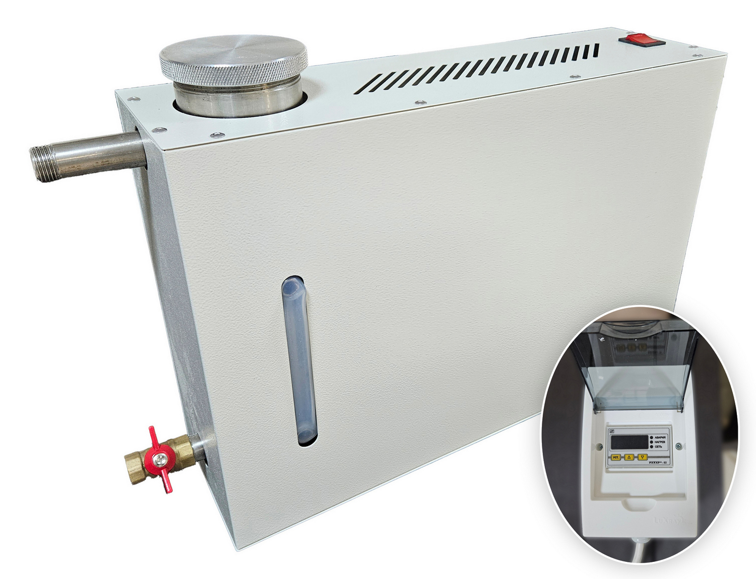 Парогенератор проточный, 2 кВт с выносным цифровым пультом управления Устройство служит для образования пара путем закипания воды. В металлическом корпусе парогенератора находится бак для воды со съемной аромаемкостью в виде сеточки. Рядом располагается индикатор в виде трубки, благодаря которому осуществляется визуальный контроль за уровнем воды. Проточные парогенераторы подключаются к водопроводу и автоматически добавляют воду в прибор при ее расходовании. Для удобства пользования парогенератор имеет выносной пульт управления, который позволяет установить температуру, мощность и время процедур парения. При достижении необходимой температуры, происходит автоматическое прекращение подачи тепла для нагрева воды. При снижении температуры более чем на 3°С, температурный датчик снова включает подогрев. Таким образом время непрерывной работы парогенератора составляет более 12 часов.