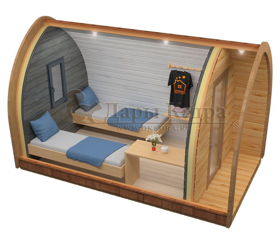 Такой кемпинг дом удобное и практичное решение для дачного использования или обустройства загородных баз отдыха. Изготовлен из хвойных пород древесины. Кровля из мягкой черепицы и цельный навес по всему фасаду изделия обеспечивают защиту от осадков. Домик включает в себя одну комнату с двумя кроватями, для удобства пользования оборудован навесным столиком, полкой и вешалкой. Входная дверь изготовлена из двойного стеклопакета.