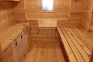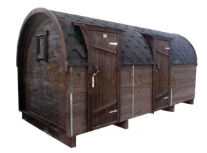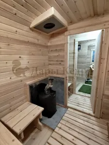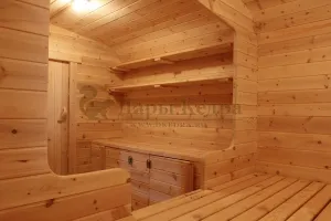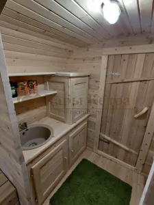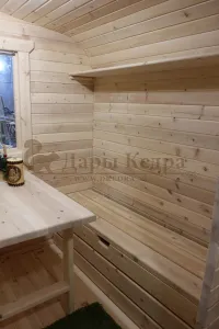 Домик с тремя помещениями подходит для дачного использования в теплое время года или обустройства загородных баз отдыха. Прихожая и кухня занимают одну комнату, в которой стоит стол из кедра. Две другие оборудованы четырьмя деревянными лежаками, по желанию их можно заменить на двуспальные кровати. Либо обустроить санузлом и душевой зоной. Для удобства пользования кемпинг дом можно укомплектовать верандой с лавочками или козырьком.