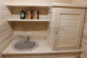 Для удобства размещения бытовых мелочей обязательно добавьте небольшие шкафчики с дверцами (2 шт) - 15 000 руб и верхние открытые полки (2 шт) - 5 000 руб. Всё необходимое в бане или доме должно быть всегда под рукой!