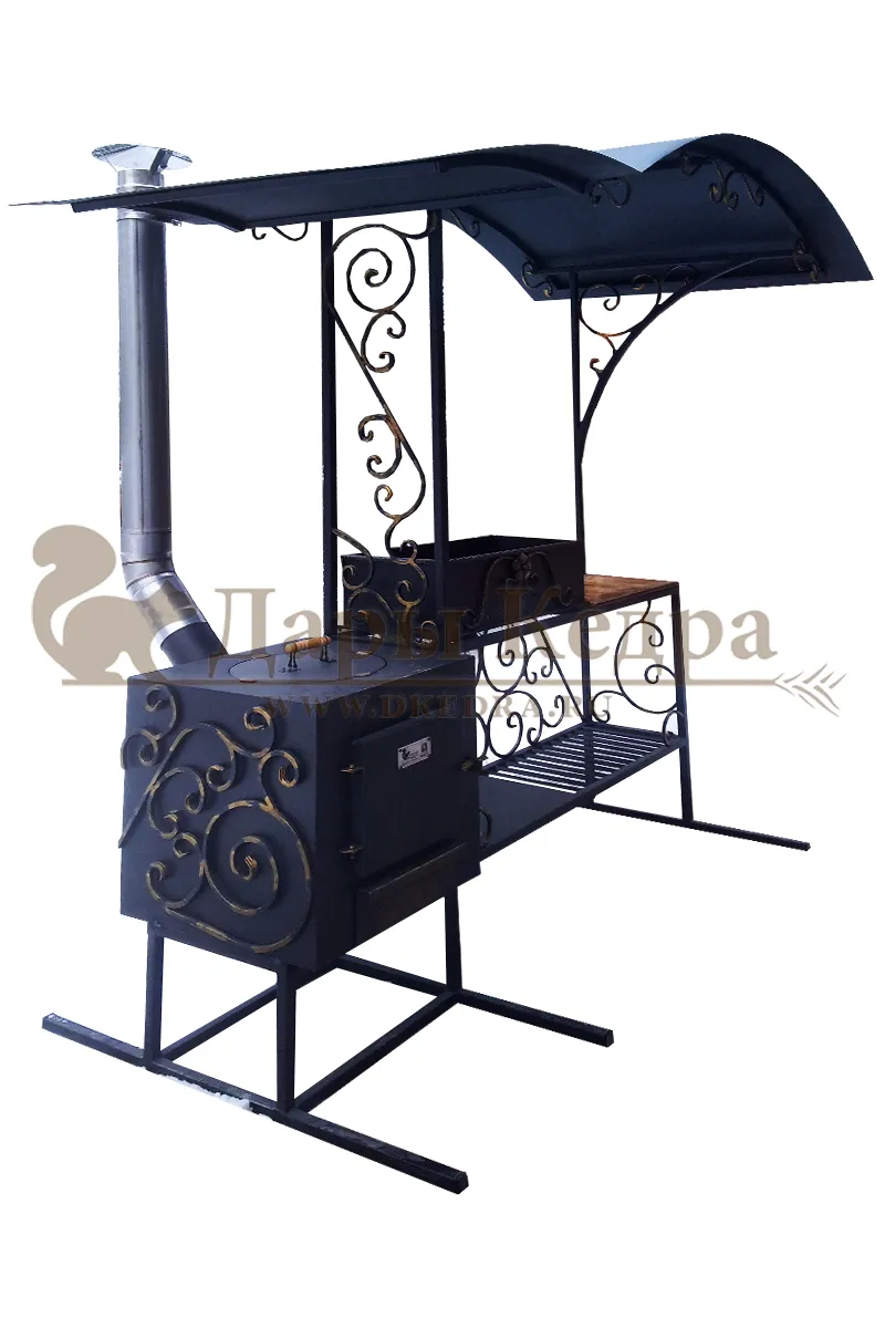 Мангал кованый Уличные мангалы отличаются современным дизайном, функциональностью и комфортной эксплуатацией. Очень прочные, разборные, поэтому могут быть перевезены с одного места на другое без каких-либо сложностей. Наши дизайнеры и технологи предусмотрели всё, чтобы приготовление пищи на природе было безопасным и быстрым. Конструкция станет украшением любого участка. Кованые элементы расскажут об утонченном вкусе владельца. Мангал состоит из классической жаровни и печи под казан, поэтому разнообразие приготовленных блюд покорит любого. Все элементы изделия покрыты специальной жаропрочной краской, защищающей от коррозии и прогорания. Изделие также имеет столик, где можно разместить необходимые приборы для жарки, а под столиком находится полка для дров. Таким образом, мы предусмотрели всё, чтобы приготовление еды на природе было комфортным, безопасным, быстрым процессом, когда всё под рукой.